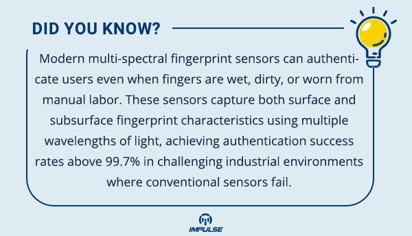 - Fingerprint sensors: Degraded performance with wet, dirty, or calloused fingers common in manufacturing or outdoor environments