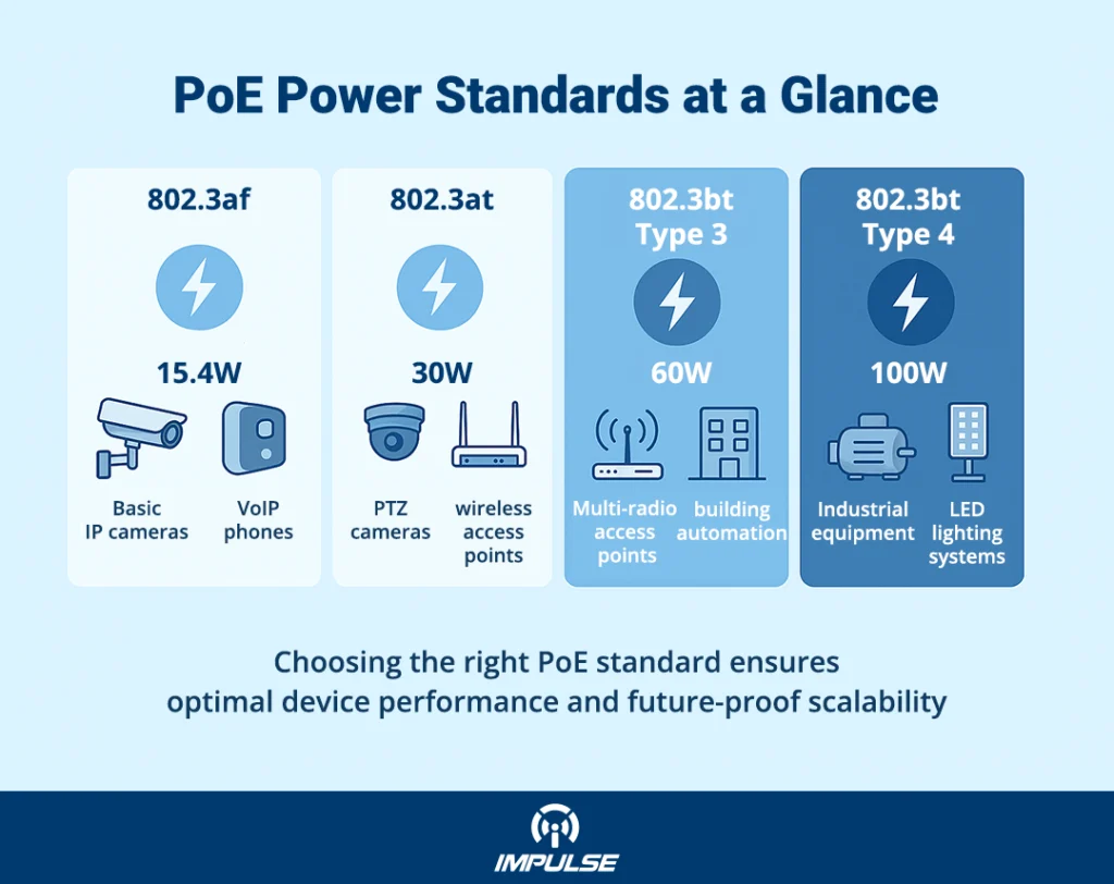 - IEEE 802.3at (PoE+): Provides up to 30 watts per port, powering PTZ cameras, high-performance wireless access points, and video phones